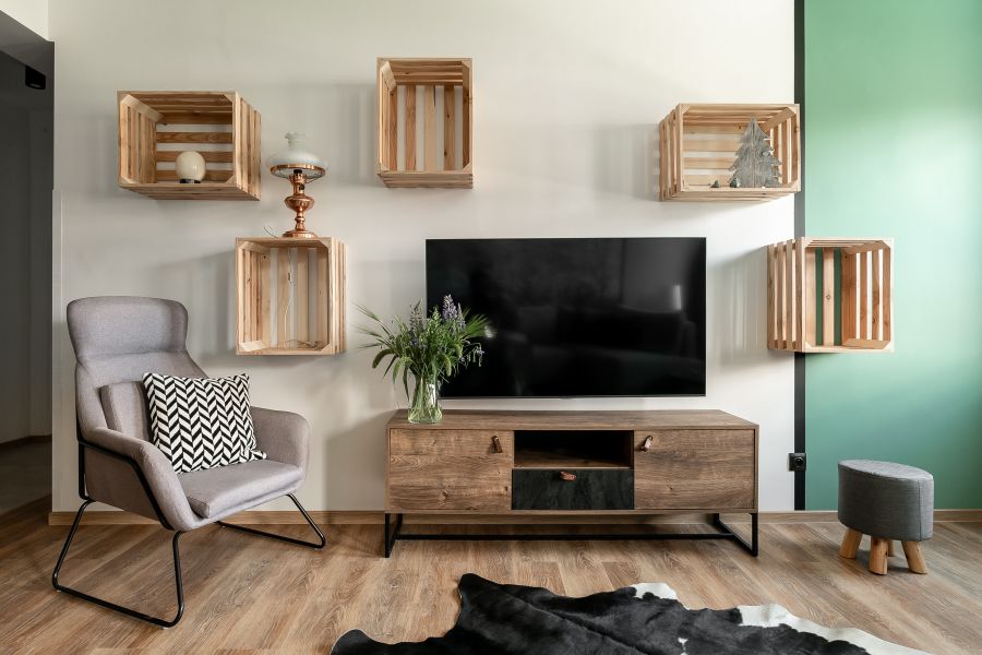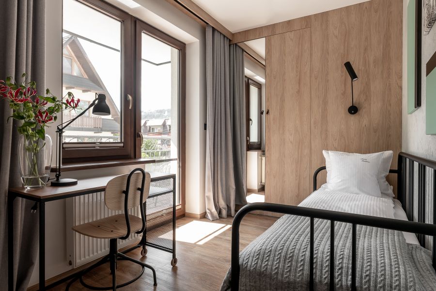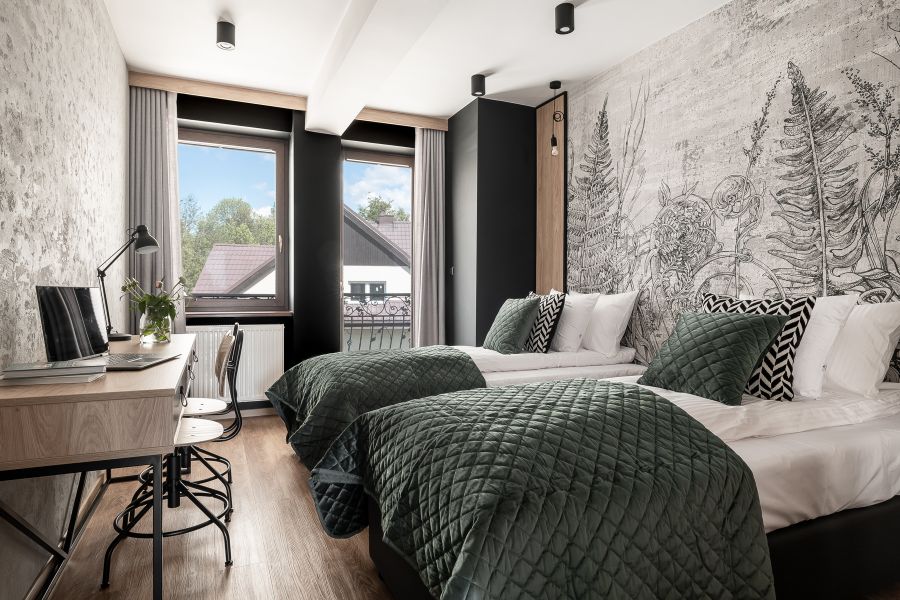 Apartament oferuje wnętrze utrzymane w tonacji szarości i butelkowej zieleni , naturalne drewno, ciekawe tapety i przytulne materiały tworzą klimatyczne otoczenie idealne do wypoczynku w górach.