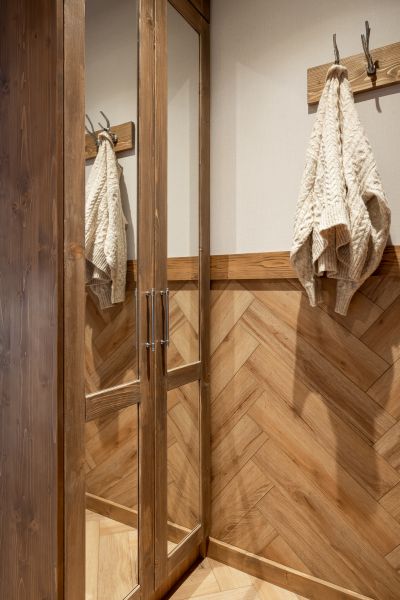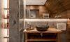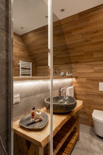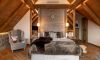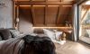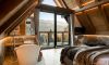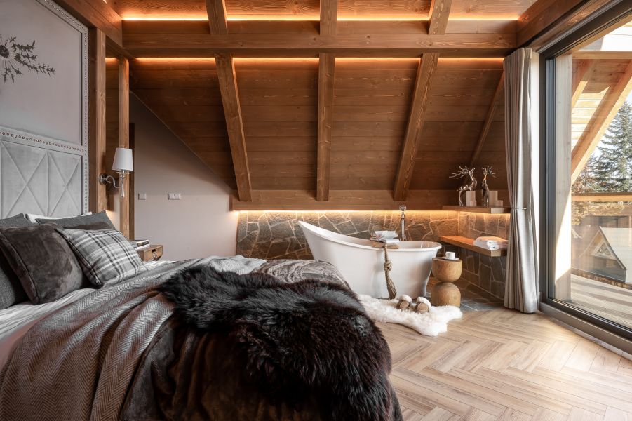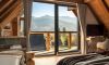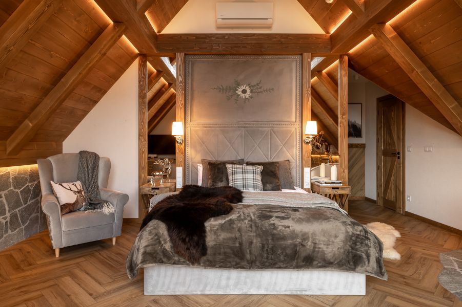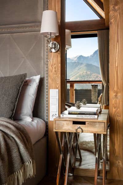 Wyobraź sobie pokój w stylu chalet, który zachwyca nie tylko elegancją, ale i magicznymi widokami na góry. Dzięki dużemu przeszkleniu od podłogi po sufitu, możesz delektować się bajecznymi krajobrazami, nie ruszając się z łóżka. Drewniane elementy oraz kamienne akcenty nadają wnętrzu rustykalnego uroku, tworząc atmosferę komfortu i relaksu.