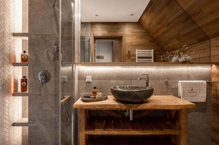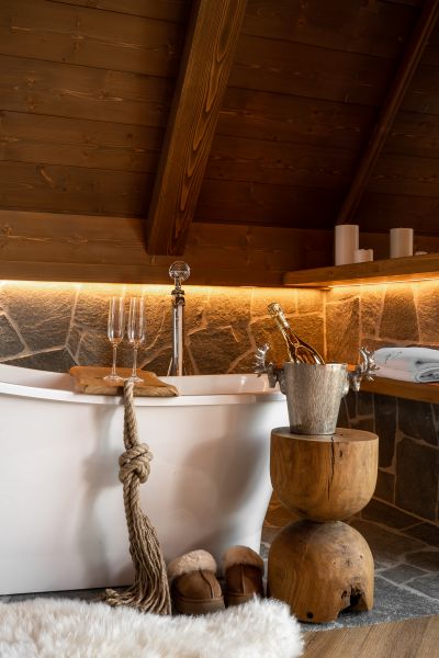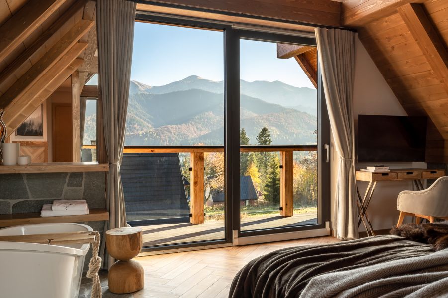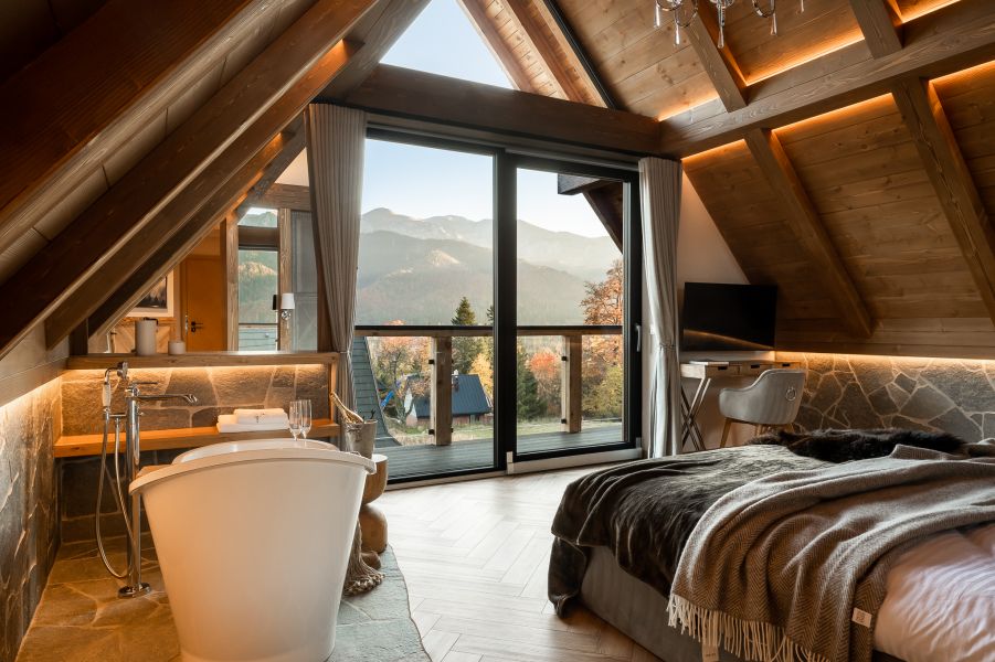 A gdy zechcesz chwilę wypocząć, zanurzysz się w luksusowej wannie, z której rozpościera się niesamowity widok na górskie szczyty. To idealne miejsce na wyciszenie się i kontemplację piękna natury. Jeśli natomiast wolisz prysznic, do twojej dyspozycji będzie dodatkowo prywatna łazienka.