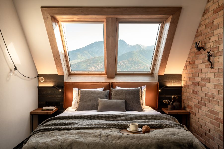 To miejsce staje się doskonałym schronieniem, w którym surowe elementy loftowego stylu harmonijnie współistnieją z miękkimi i ciepłymi dodatkami, tworząc atmosferę pełną kontrastów i relaksu. Przez dachowe okna sypialni zagląda Giewont, co dodaje wnętrzu wyjątkowego uroku i widoku na góry.