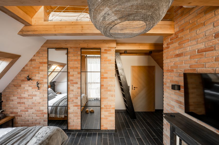 Wyjątkowy pokój, w którym miękkie materiały w ciepłych kolorach doskonale przełamują surowość ceglanej ściany oraz industrialnego stylu. Przestronny pokój o wysokich sufitach rozciąga się przez dwie kondygnacje, wypełniając wnętrze naturalnym światłem dzięki dużemu przeszkleniu. Wygodne łóżko i przyjemny w dotyku koc sprawiają, że pokój staje się idealnym miejscem na relaks.