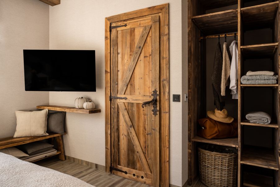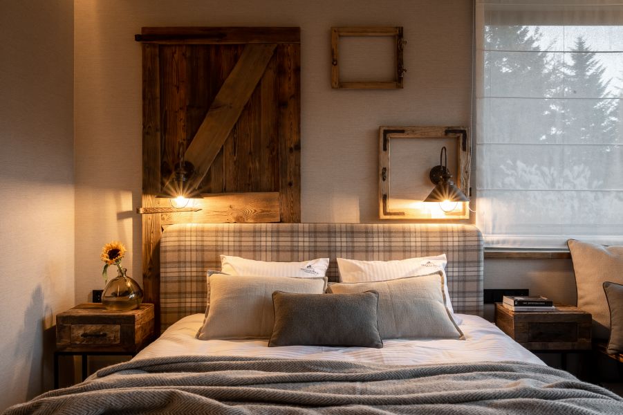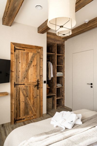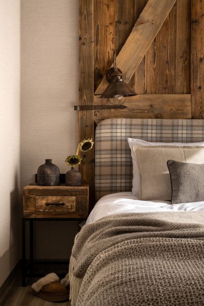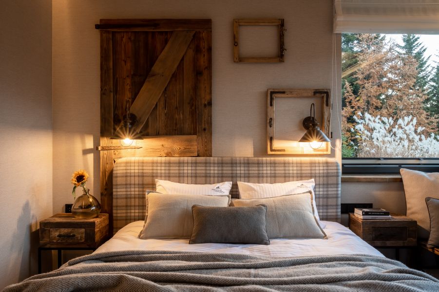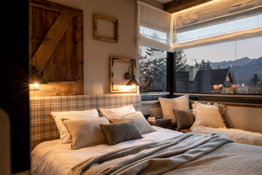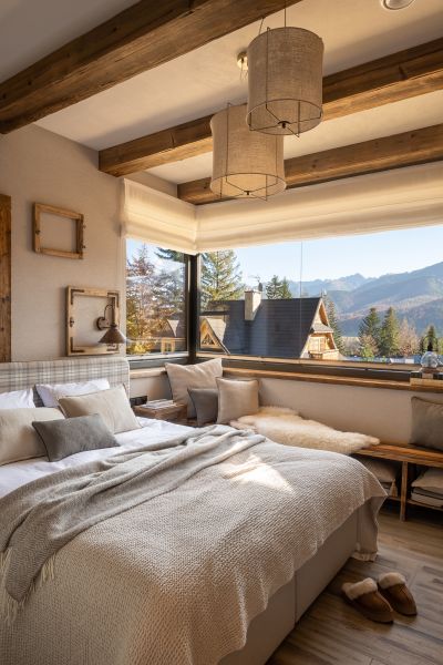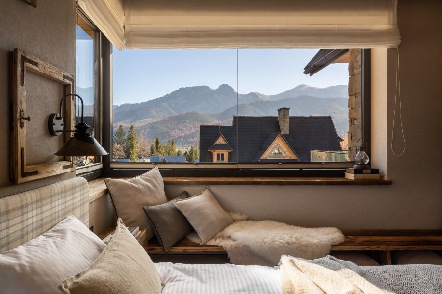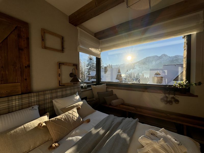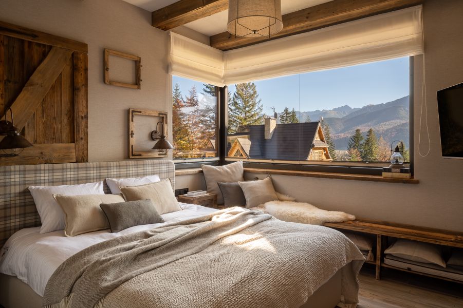 Wielkie panoramiczne okno otwiera zapierający dech w piersiach widok na majestatyczne Tatry, zalewając pokój naturalnym światłem i wprowadzając harmonię otaczającej przyrody. Przytulne łóżko oraz rustykalne meble sprawiają, że poczujesz się jak w bajce, gdzie czas płynie wolniej, a każdy moment spędzony w tym pokoju jest pełen relaksu.