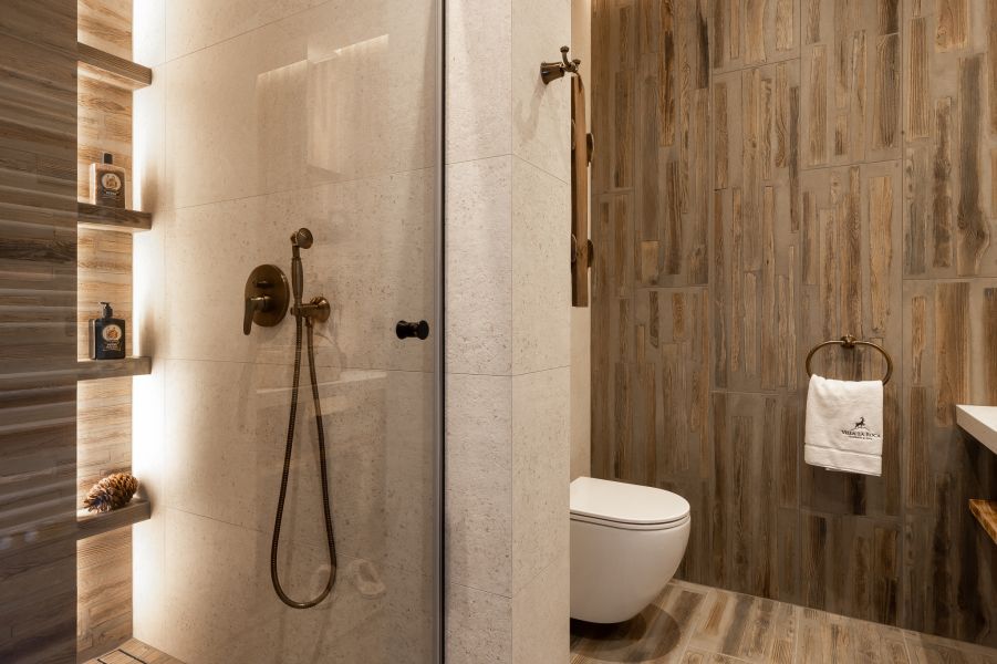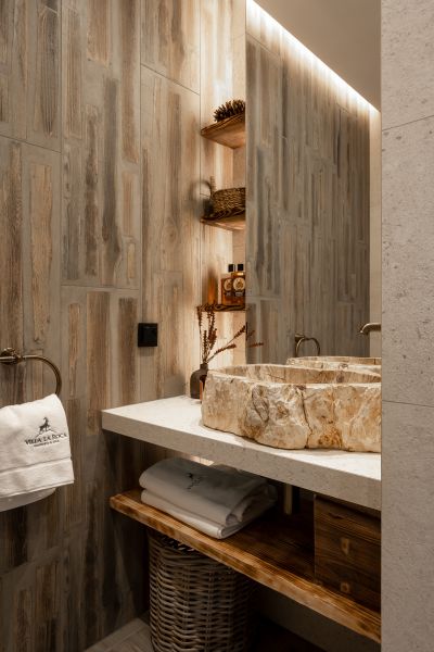 W prywatnej łazience zachwyci Cię wyjątkowa umywalka ze skamieniałego drewna. Doświadczysz tu magii sielskiej atmosfery, która otuli Cię jak ciepły koc w chłodne dni, tworząc idealne warunki do wypoczynku i relaksu. To przestrzeń, w której poczujesz się naprawdę wyjątkowo.