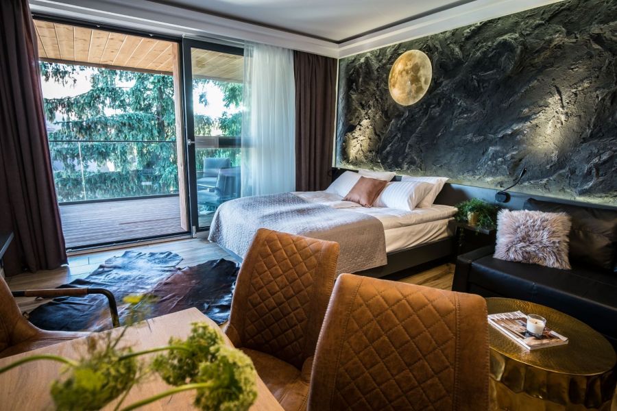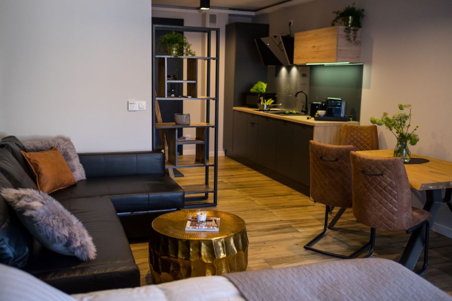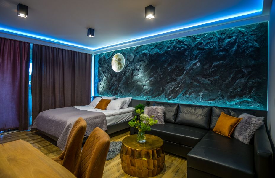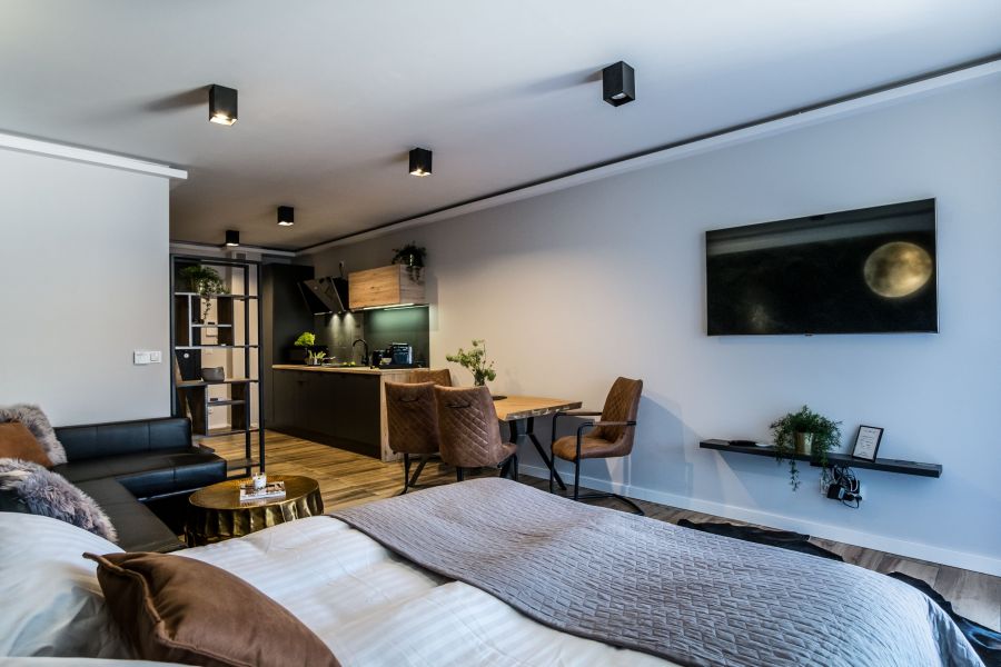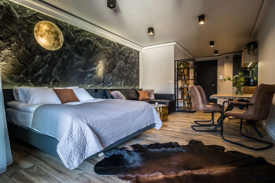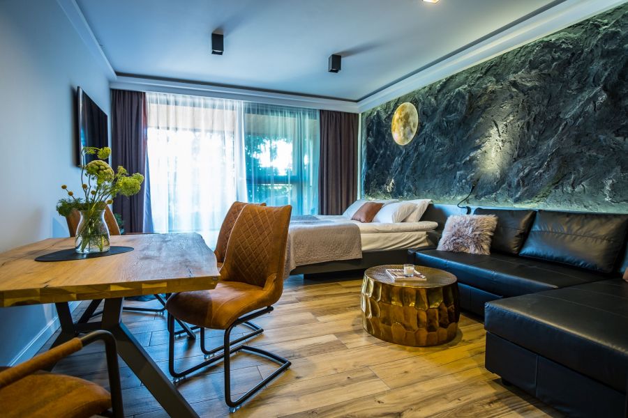 Księżycowa atmosfera studia MOON zachwyci koneserów wyjątkowych wnętrz. Komfortowe mieszkanie jest idealne dla par, ale pomieści maksymalnie 4 os. Duży taras otoczony drewnianą zabudową oraz sąsiadującą zielenią umożliwi błogi relaks. Studio oferuje dobrze wyposażony aneks kuchenny, łazienkę oraz miejsce w garażu podziemnym.